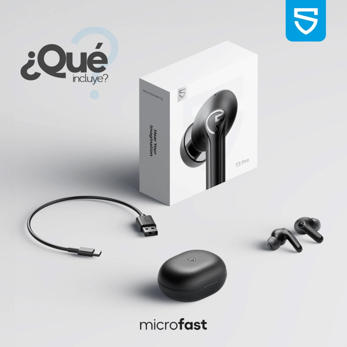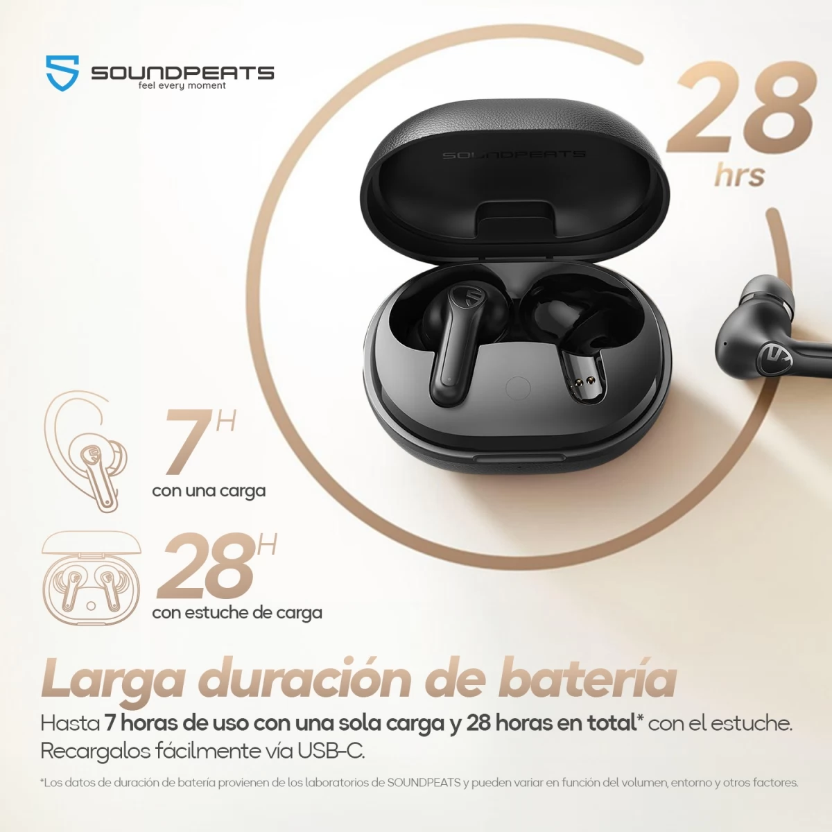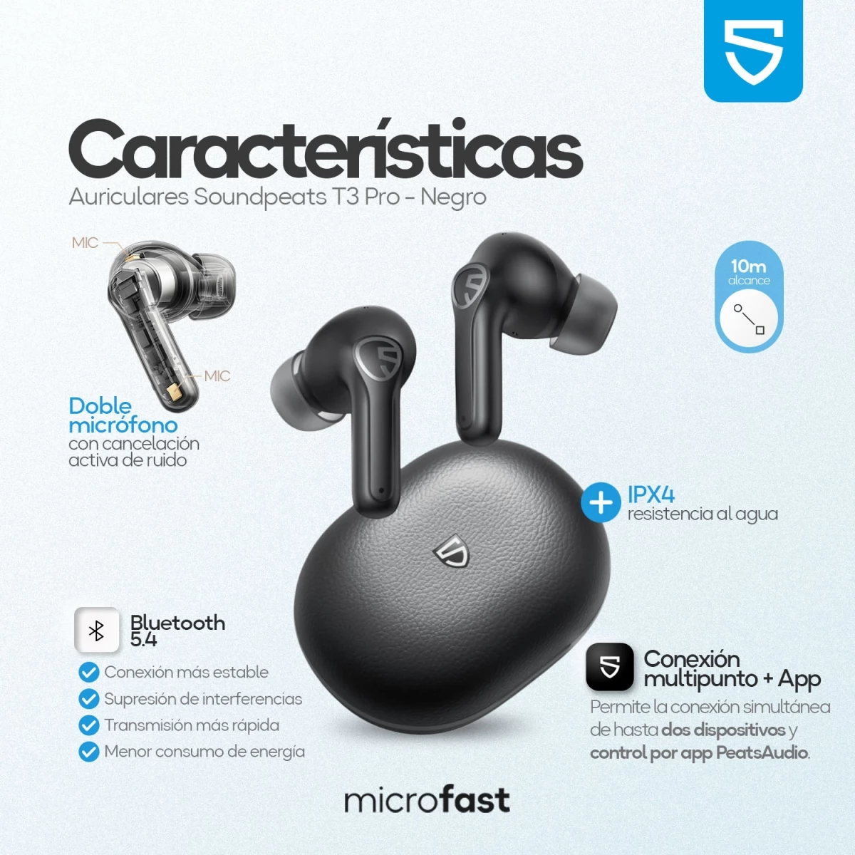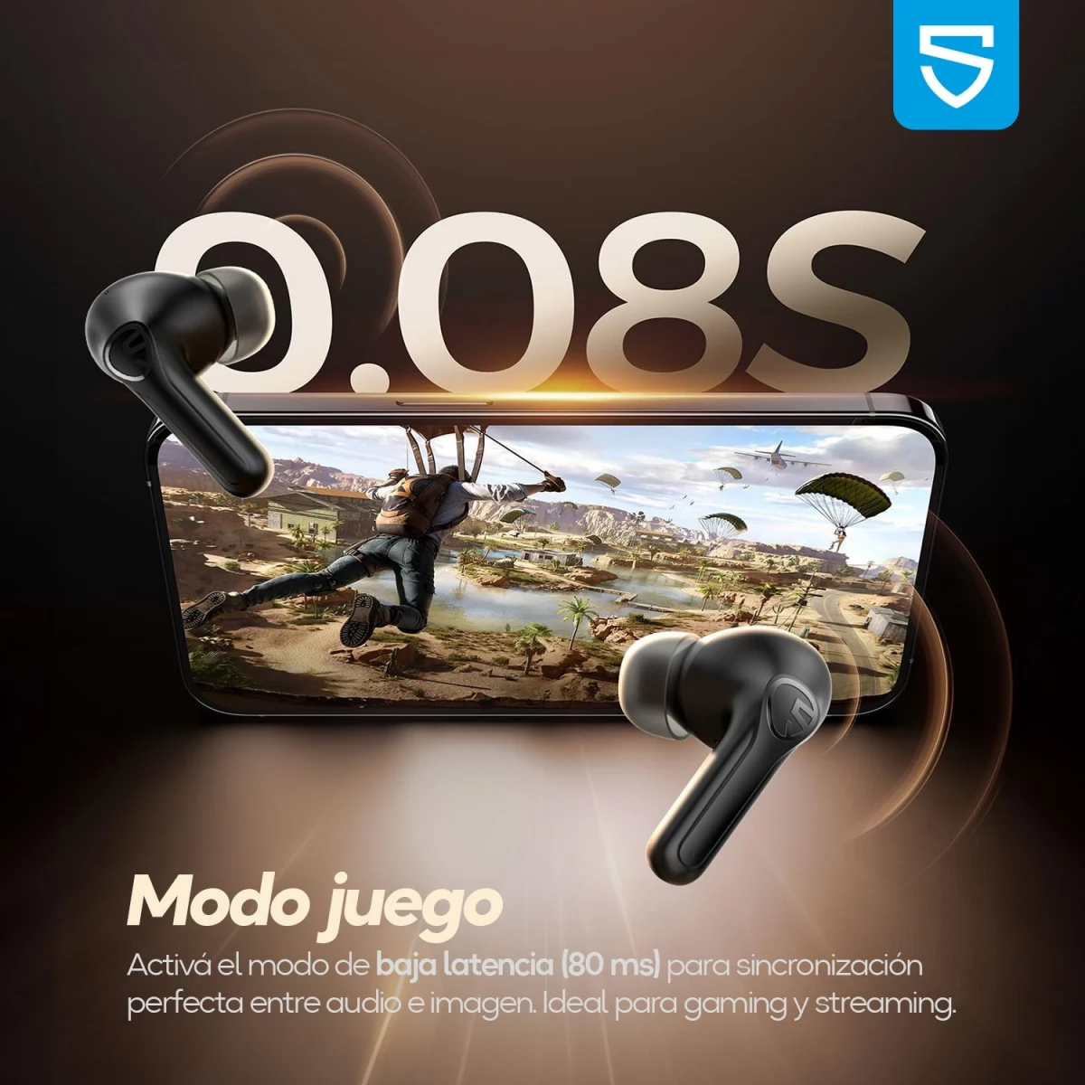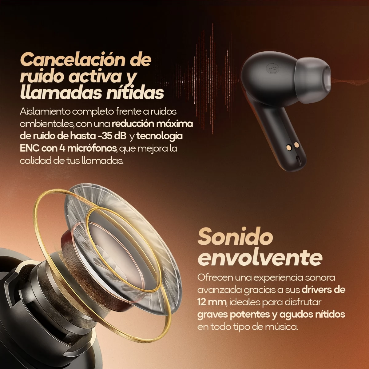 Auriculares in-ear con Bluetooth 5.4, cancelación de ruido activa y 4 micrófonos ENC. Hasta 28 horas de autonomía con el estuche. Audio potente con drivers de 12 mm, resistencia al agua IPX4 y modo transparente. Ideales para música, llamadas y gaming. Tecnología Bluetooth 5.4 Conexión estable, emparejamiento rápido y bajo consumo energético. Perfectos para usar en movimiento, en casa o en la oficina. Cancelación de ruido activa y llamadas nítidas Cuentan con cancelación activa de ruido (ANC) para una inmersión total en la música, y tecnología ENC con 4 micrófonos, que mejora la calidad de tus llamadas reduciendo el ruido ambiental. Modo transparente Escuchá lo que pasa a tu alrededor sin quitarte los auriculares. Ideal para caminar por la ciudad o moverte en ambientes compartidos. Latencia ultrabaja para juegos y videos Activá el modo de baja latencia (80 ms) para sincronización perfecta entre audio e imagen. Ideal para gaming y streaming. Larga duración de batería Hasta 7 horas de uso con una sola carga y 28 horas en total con el estuche. Recargalos fácilmente vía USB-C. Resistentes al agua Gracias a la certificación IPX4, son aptos para entrenamientos, caminatas bajo la lluvia o el uso diario en exteriores. Características técnicas - Formato: In-ear - Tipo de control: Táctil - Versión Bluetooth: 5.4 - Códecs: SBC / AAC - Chipset: BT8932F - Driver: 12 mm (bio-compuesto) - Micrófonos: 4 con ENC - Autonomía auriculares: 7 hs - Autonomía total con estuche: 28 hs - Capacidad estuche: 360 mAh - Capacidad auriculares: 40 mAh c/u - Tiempo de carga (auriculares): 1.5 hs - Tiempo de carga (estuche): 2 hs - Puerto de carga: USB-C -Cargador: 5V 1A (No incluido) No usar cargadores de carga rápida. - Rango inalámbrico: 10 m - Nivel de impermeabilidad: IPX4 - Compatible con app PeatsAudio - Garantía oficial: 12 meses