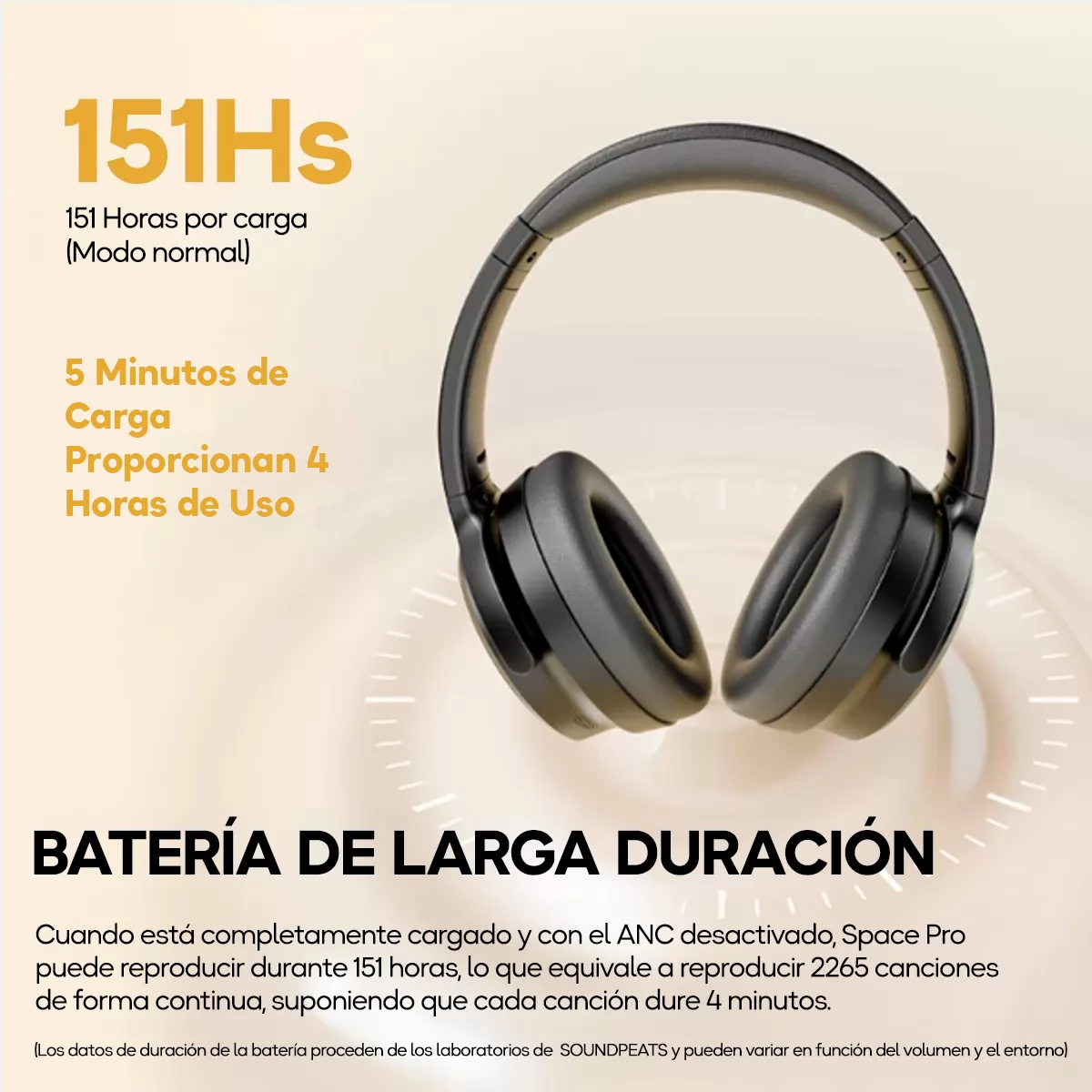 Cancelación activa de ruido híbrida de hasta -35 dB La tecnología ANC híbrida combina retroalimentación y prealimentación para reducir hasta un 95 % del ruido ambiente. Disfrutá tu música, llamadas o contenidos incluso en espacios ruidosos, con una cancelación efectiva y envolvente. Sonido Hi-Res con potencia y definición Equipados con controladores dinámicos grandes de 40 mm, entregan sonido estéreo de alta resolución, con agudos definidos y graves potentes. Además, incorporan tecnología ENC en llamadas, que reduce el ruido de fondo para una comunicación nítida en cualquier entorno. Batería de ultra duración + carga rápida - Hasta 151 horas de reproducción total - Hasta 75 horas con ANC activado - Hasta 4 horas de uso con solo 5 minutos de carga Y si necesitás seguir usándolos cuando se quedan sin batería, podés conectarlos mediante cable auxiliar. Comodidad premium para todo el día Diseño over-ear liviano y ergonómico, con almohadillas de espuma viscoelástica y cuero sintético proteico. La estructura es plegable y los cascos giran para facilitar su transporte. Su peso de 264 g los hace cómodos incluso durante largas sesiones de uso. Bluetooth 5.4 y conexión multipunto Ofrecen conexión inalámbrica estable, menor consumo energético y la posibilidad de conectarlos a dos dispositivos en simultáneo. Alterná fácilmente entre el celular y la notebook sin volver a emparejar. Gestión inteligente desde la app PEATS AUDIO Con la app PEATS AUDIO podés ajustar la ecualización dinámica, crear tu propio perfil mediante ecualización personalizada y visualizar en tiempo real el nivel de batería. Además, permite configurar los modos de cancelación de ruido y acceder a funciones adicionales según el modelo, para una experiencia completamente adaptada a tu forma de escuchar. Especificaciones técnicas - Modelo: Space Pro - Formato: Over-ear (circumaural) - Bluetooth: 5.4 - Cancelación de ruido: Híbrida ANC (-35 dB) - Cancelación de ruido en llamadas: Sí (ENC) - Controladores: 40 mm + 10 mm - Certificación: Hi-Res Audio - Modo con cable: Sí (entrada auxiliar) - Autonomía total: hasta 151 horas - Autonomía con ANC: hasta 75 horas - Carga rápida: 4 horas de uso con 5 minutos de carga - Peso: 264 g - Conexión multipunto: Sí - Materiales: Cuero sintético y espuma viscoelástica - Alimentación: 5V 1A (no usar cargadores rápidos)