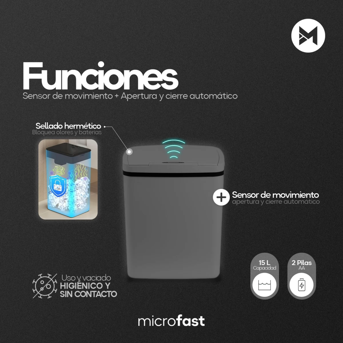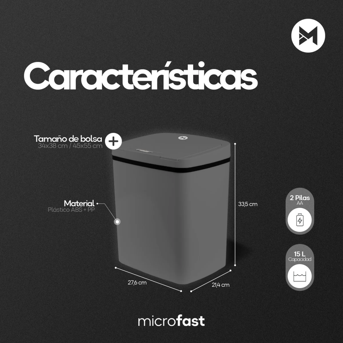 Apertura automática sin contacto El cesto incorpora un sensor infrarrojo que detecta el movimiento de la mano u objetos a menos de 15 cm, activando la apertura automática de la tapa. Una forma práctica e higiénica de desechar residuos sin tocar el cesto. Cierre automático inteligente Luego de unos segundos sin detectar movimiento, la tapa se cierra automáticamente. Si el sensor continúa detectando presencia, la tapa permanecerá abierta para facilitar su uso. Diseño compacto y funcional Gracias a su tamaño práctico de 15 litros, este cesto es ideal para baños o espacios donde se necesite una solución higiénica y moderna para la gestión de residuos. Funcionamiento simple y eficiente Solo necesitás colocar las pilas y el cesto comenzará a funcionar automáticamente. Garantiza un bajo consumo de energía y una larga vida útil. Ficha Técnica: - Modelo: MF-601-15 - Capacidad: 15 Litros - Material principal: ABS + PP (plástico de alta resistencia) - Componentes adicionales: ABS + PP - Color: Gris - Medidas: 27 x 21 x 33 cm ±1 cm - Compatibilidad de bolsa: 34×38 o 45×55 cm - Medidas con la tapa abierta: 27 x 21 x 45 cm - Dimensiones de la boca del cesto: 23 x 13 cm - Ubicación recomendada: Interior - Tipo de apertura: Automática por sensor + botón manual de apertura y cierre - Alimentación: 2 pilas AA (1,5 V x 2 = 3 V) NO INCLUIDAS - Duración estimada de pilas: 3 meses (aprox. 20 aperturas diarias) - Tiempo de cierre automático: 5 segundos - Indicador luminoso: Sí (detección de movimiento) Contenido de la caja - 1 Unidad de cesto - 1 Aro sujetador de bolsa - 1 Tapa - Manual de usuario Fácil de armar y utilizar. Se recomienda leer atentamente el manual de uso antes de su instalación o primer uso para asegurar un correcto funcionamiento y prolongar la vida útil del producto. ATENCIÓN!!!! Sugerimos no descartar ningún componente del empaquetado (telgopor, bolsas, Soporte de packaging, etc.) ya que en caso de devoluciones será requisito enviarlo completo para poder realizar la reposición correctamente.