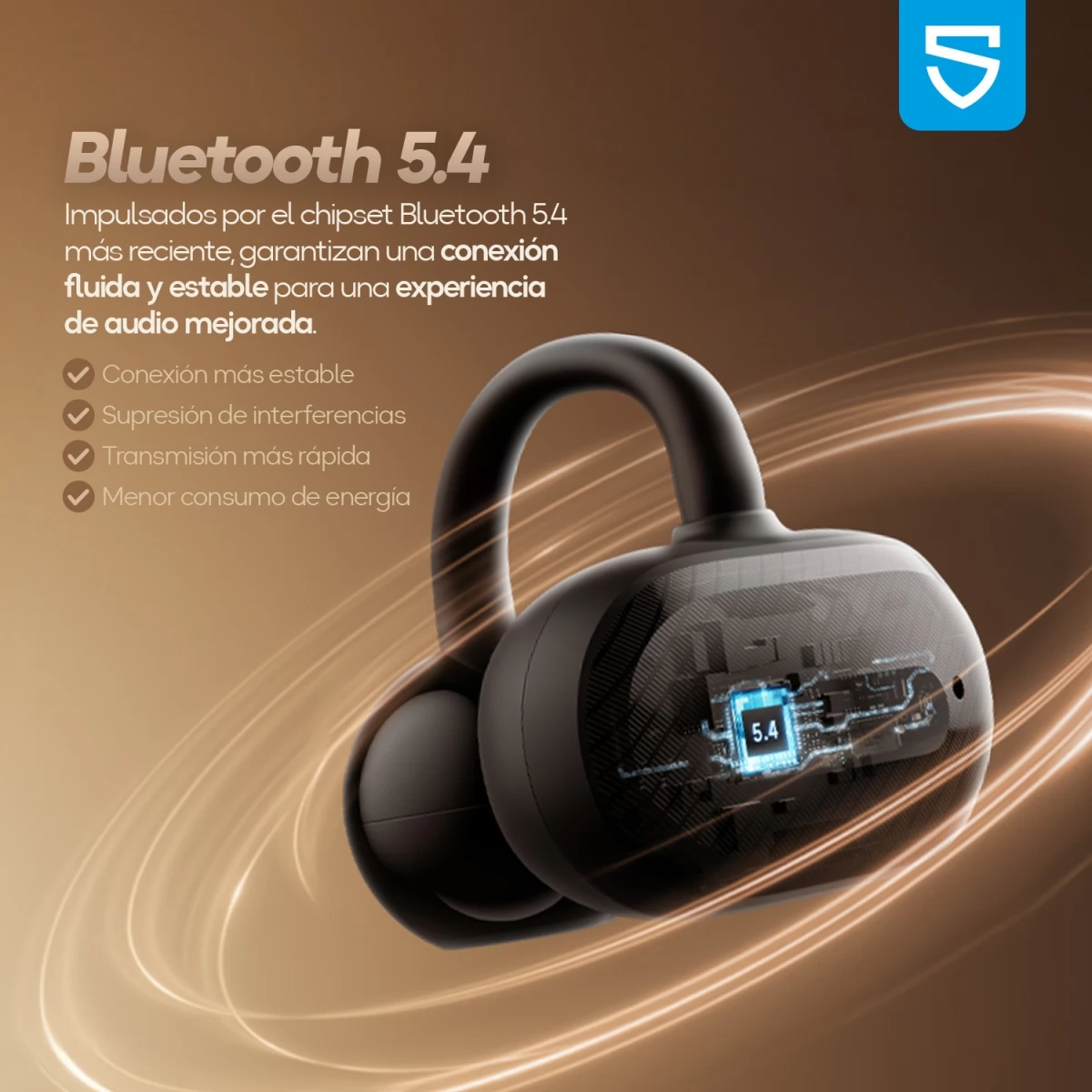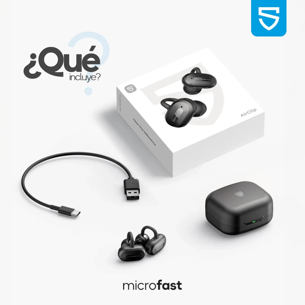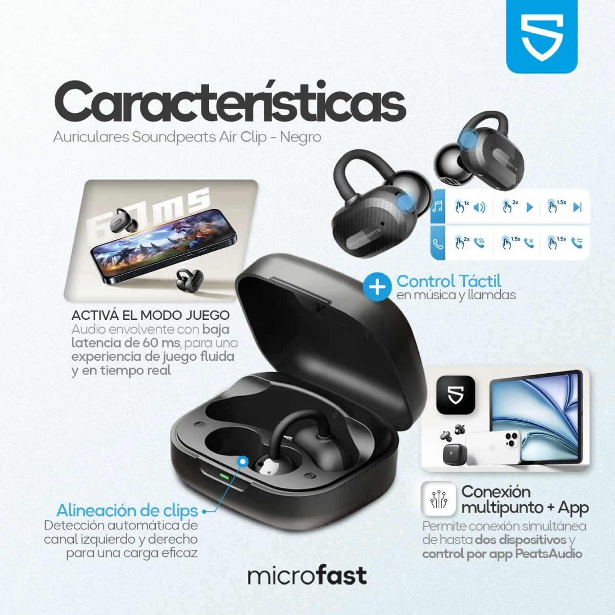 Los SoundPEATS Air Clip redefinen la forma de escuchar música con un diseño Open-Ear Clip-On, que no se inserta en el canal auditivo y permite mantener la percepción del entorno. Su estructura liviana de solo 5,1 g por auricular garantiza comodidad prolongada y ajuste seguro. Incorporan drivers magnéticos duales de 12 mm con transmisión de sonido direccional y ecualización dinámica, logrando un audio espacial envolvente con graves profundos, voces claras y agudos definidos. A través de la aplicación oficial SoundPEATS, podes personalizar el sonido mediante ecualizador avanzado y ajustes predefinidos según estilo musical o ambiente. Conexión multipunto que permite emparejar dos dispositivos en simultáneo y alternar sin interrupciones. Además, integran controles táctiles para gestionar llamadas, música y volumen directamente desde los auriculares. Con una autonomía de 6 a 8 hs horas por carga dependiendo del volumen de uso y un total de 28 horas con el estuche de carga inalámbrica y USB-C, los Air Clip son ideales para uso diario, trabajo y entrenamiento. Ideal para: - Usuarios que buscan auriculares cómodos y no invasivos. - Actividades al aire libre como caminar, entrenar o andar en bicicleta. - Profesionales que necesitan alternar entre llamadas y música sin perder percepción del entorno. - Uso prolongado gracias a su diseño ligero y autonomía extendida. Ficha técnica - Formato: Open-Ear tipo clip - Peso: 5,1 g cada auricular - Drivers: 12 mm dual magnéticos - Audio: Hi-Res Wireless, sonido espacial, ecualización dinámica - Conectividad: Bluetooth 5.4 - Conexión multipunto: Sí, hasta 2 dispositivos simultáneos - Controles: Táctiles multifunción - Compatibilidad: iOS, Android, Windows, macOS, Linux - Batería auriculares: 6 a 8 horas de reproducción continua - Autonomía total: 28 horas con estuche - Capacidad de la batería Estuche : 300 mAh mAh - Capacidad de la batería auriculares: 40mAh*2 - Cargador: 5V 1A (No usar cargadores de carga rápida) - Resistencia: IPX5 Qué incluye - 1 par de auriculares SoundPEATS Air Clip - 1 estuche de carga con soporte para carga inalámbrica y USB-C - 1 cable USB-C - 1 manual de usuario en español