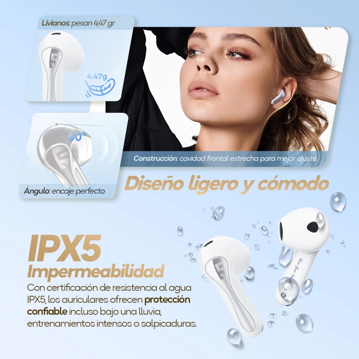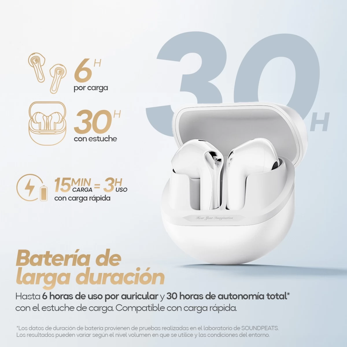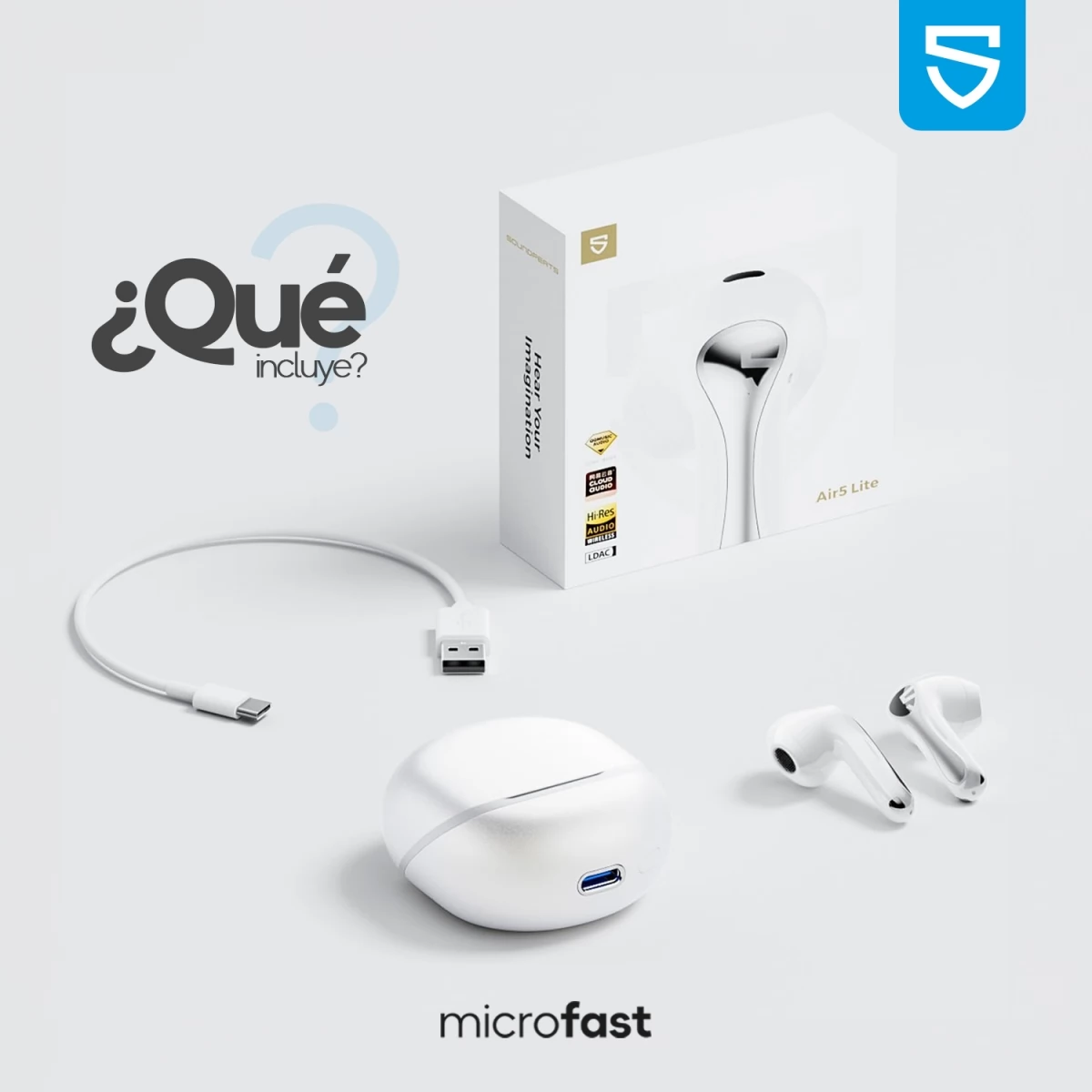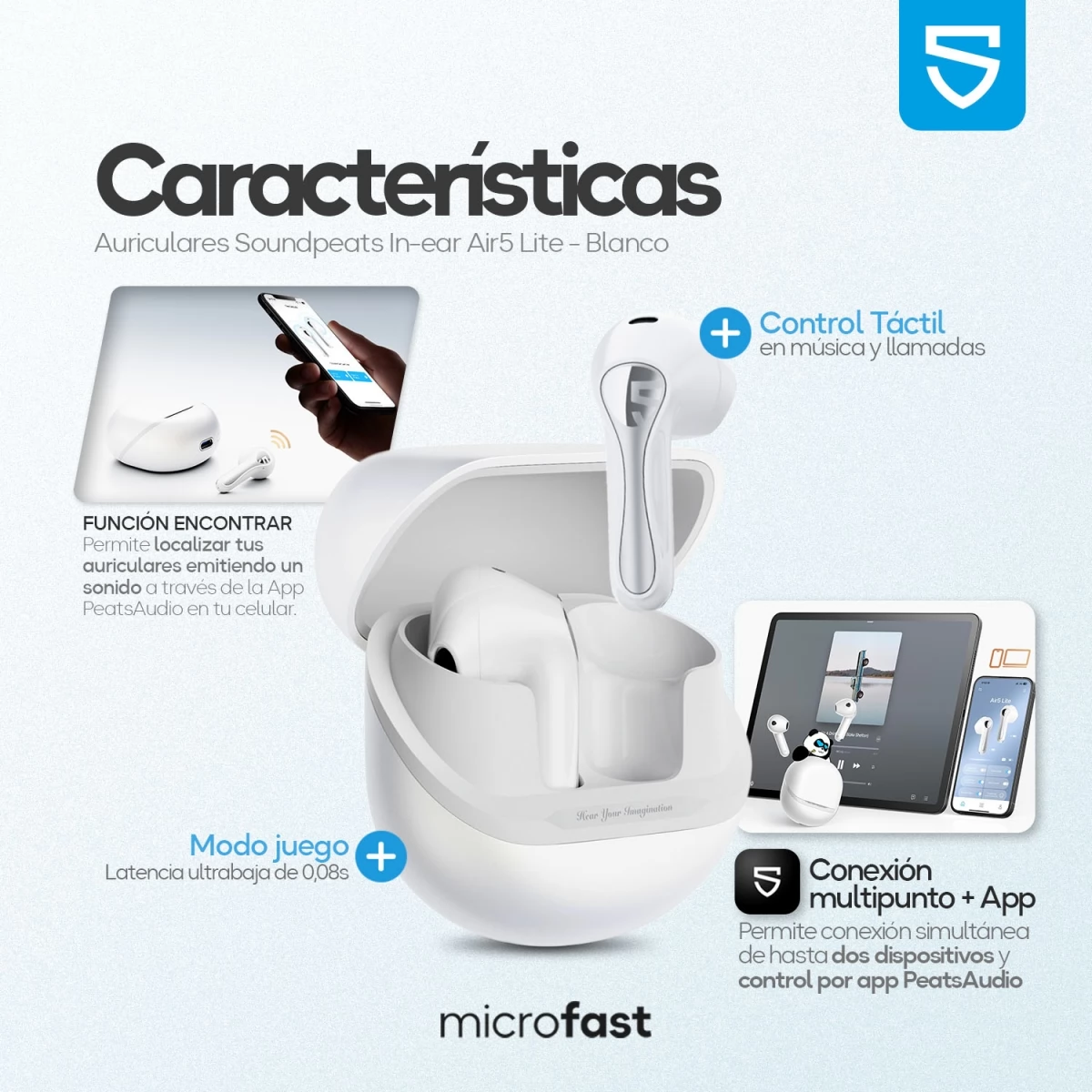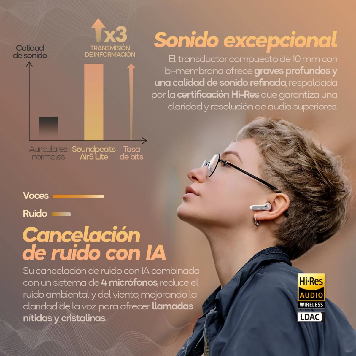 Los Air 5 Lite son la combinación perfecta entre practicidad y estética. Un diseño único y ligero para un transporte cómodo, vayas donde vayas. Además, cuentan con certificación Hi-Res, para que además de llevar tu música a todos lados, lo hagas con la mejor calidad. Ecualizá a tu gusto desde la APP específica, PeatsAudio, y convertí tu experiencia musical en un momento completamente moldeado para vos. CALIDAD DE SONIDO HI-RES La certificación Hi-Res permite frecuencias de hasta 192 kHz y 24 bits de profundidad, ofreciendo un sonido nítido y dinámico. Los Soundpeats Air 5 lite entregan graves profundos y potentes sin perder claridad en medios y agudos, ideales para amantes de la música. BLUETOOTH 5.4 Y CHIP BT8932F Con el chip BT8932F Bluetooth 5.4, el AIR 5 LITE de SoundPeats brinda una conexión robusta y eficiente en entornos complicados o distancias largas. Además, reduce el consumo de energía, prolongando la vida útil de los auriculares. ALTAVOZ DE BIODIAFRAGMA DE 13 MM El diafragma compuesto de tres materiales asegura graves potentes, voces cálidas y agudos claros. Con una bobina dinámica de 13 mm, reproduce fielmente tanto las melodías delicadas como los ritmos intensos. REDUCCIÓN INTELIGENTE DE RUIDO POR IA El sistema adaptativo de reducción de ruido del AIR 5 LITE de SoundPeats detecta el entorno en tiempo real para ajustar los parámetros, eliminando hasta un 90% del ruido del viento gracias a su malla a prueba de viento y diseño aerodinámico. 30 HORAS DE BATERÍA Con una batería de alta densidad, alcanza hasta 30 horas de uso total. El estuche de carga es más compacto, con una mayor capacidad que permite un uso confiable y seguro. COMODIDAD ULTRALIGERA El diseño liviano y ergonómico del AIR 5 LITE de SoundPeats, con solo 3.8 g por auricular, se ajusta perfectamente al oído, minimizando la presión para un uso prolongado sin molestias. ESTUCHE DE CARGA COMPACTO El estuche es un 20.5% más pequeño que su predecesor, el Air4, y cuenta con un ángulo de apertura de 45 grados que facilita su uso. Además, la reducción de ruido en los altavoces alcanza el 28.57%. ---- FICHA TÉCNICA ---- - Csncelación de ruido en llamadas: Si - Conector de auriculares: Tipo-C - Conectividad: Inalámbrica - Versión de conectividad: Bluetooth 5.4 - Distancia de escucha: 10 metros - Material: Silicona, Plástico - Control: Táctil - Nivel de resistencia al agua: IPX5 - Batería recargable: Sí - Modo Gamer: Sí - Cantidad de micrófonos incorporados: 4 - Altavoz de biodiafragma: 13 mm - Características adicionales: AI Anti-ruido del viento, App PeatsAudio - Alimentación: 5V 1A (importante: no utilizar cargadores de carga rápida) ---- ¿QUÉ INCLUYE? ---- 1 x Auriculares Air 5 Lite SoundPeats 1 x Cable de Tipo-C 1 x Manual de usuario