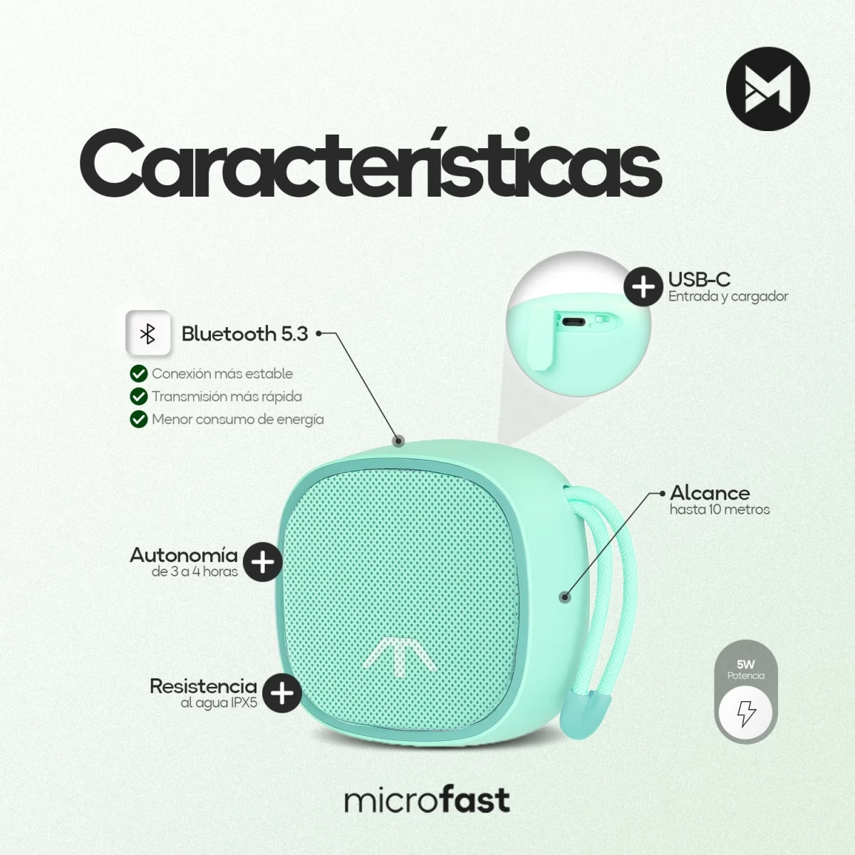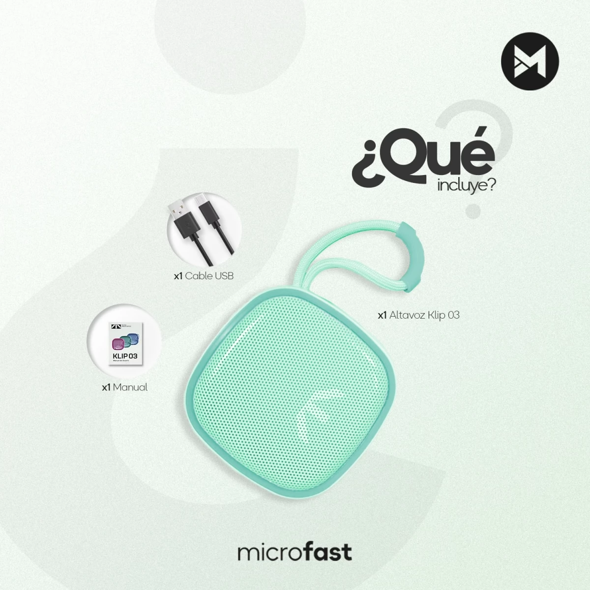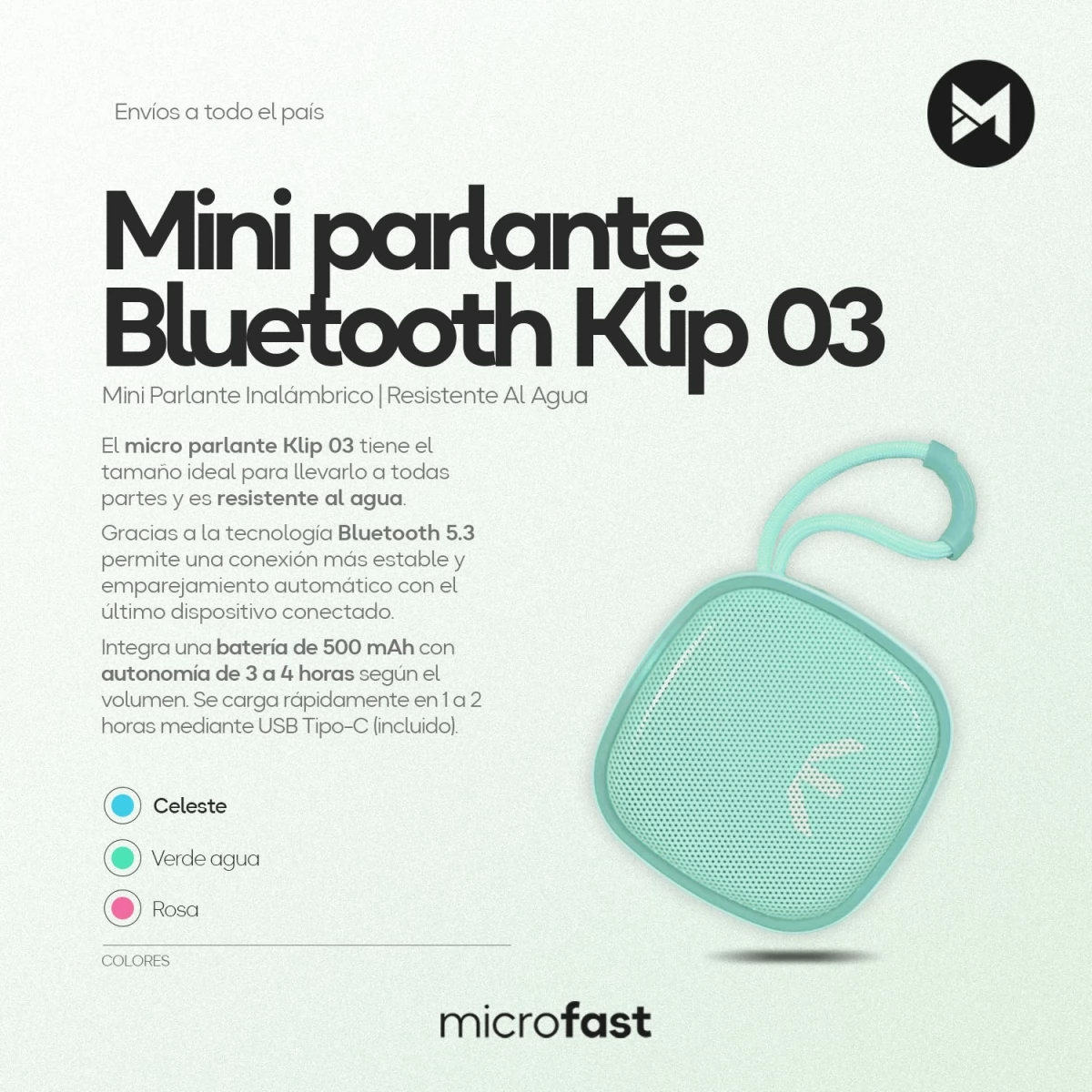 Conectividad moderna y versátil Gracias a la tecnología Bluetooth 5.3 y función TWS, permite una conexión más estable y emparejamiento con otro parlante compatible para lograr sonido estéreo. Resistencia al agua IPX5 Preparado para soportar salpicaduras de agua y sudor, perfecto para uso al aire libre, entrenamientos o escapadas de fin de semana. Batería recargable y carga rápida Integra una batería de 500 mAh con autonomía de 3 a 4 horas según el volumen. Se carga rápidamente en 1 a 2 horas mediante USB Tipo-C (Incluido). Contenido del producto: - Parlante portátil modelo KLIP 03 - Correa integrada - Manual de uso - Caja original - Cable USB Tipo-C Especificaciones técnicas: - Potencia: 5W (driver Ø52mm, 4Ω) - Bluetooth: 5.3 con TWS - Alcance inalámbrico: hasta 10 metros - Autonomía: 3 a 4 horas - Tiempo de carga: 1 a 2 horas - Capacidad de batería: 500 mAh - Carga: USB Tipo-C (DC 5V, 1A) - Resistencia al agua: IPX5 Ideal para usar donde quieras Perfecto para escuchar música en casa, al aire libre, en la oficina o durante los entrenamientos. Liviano, resistente y siempre listo para acompañarte.