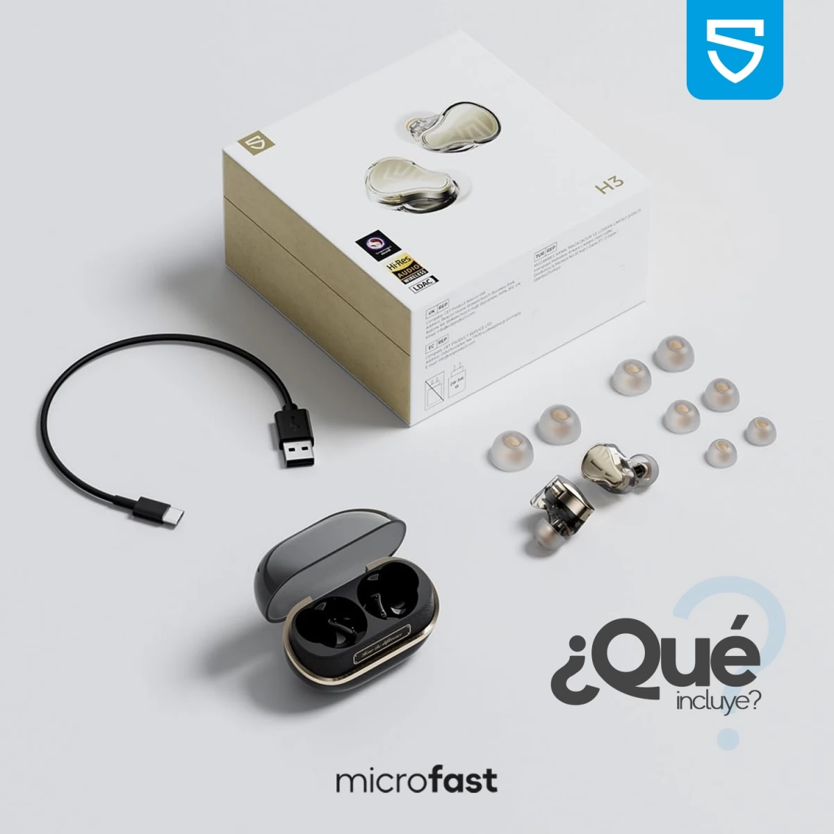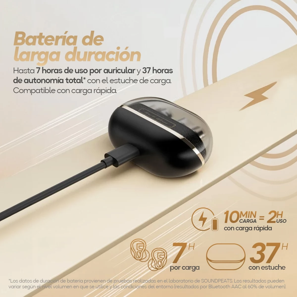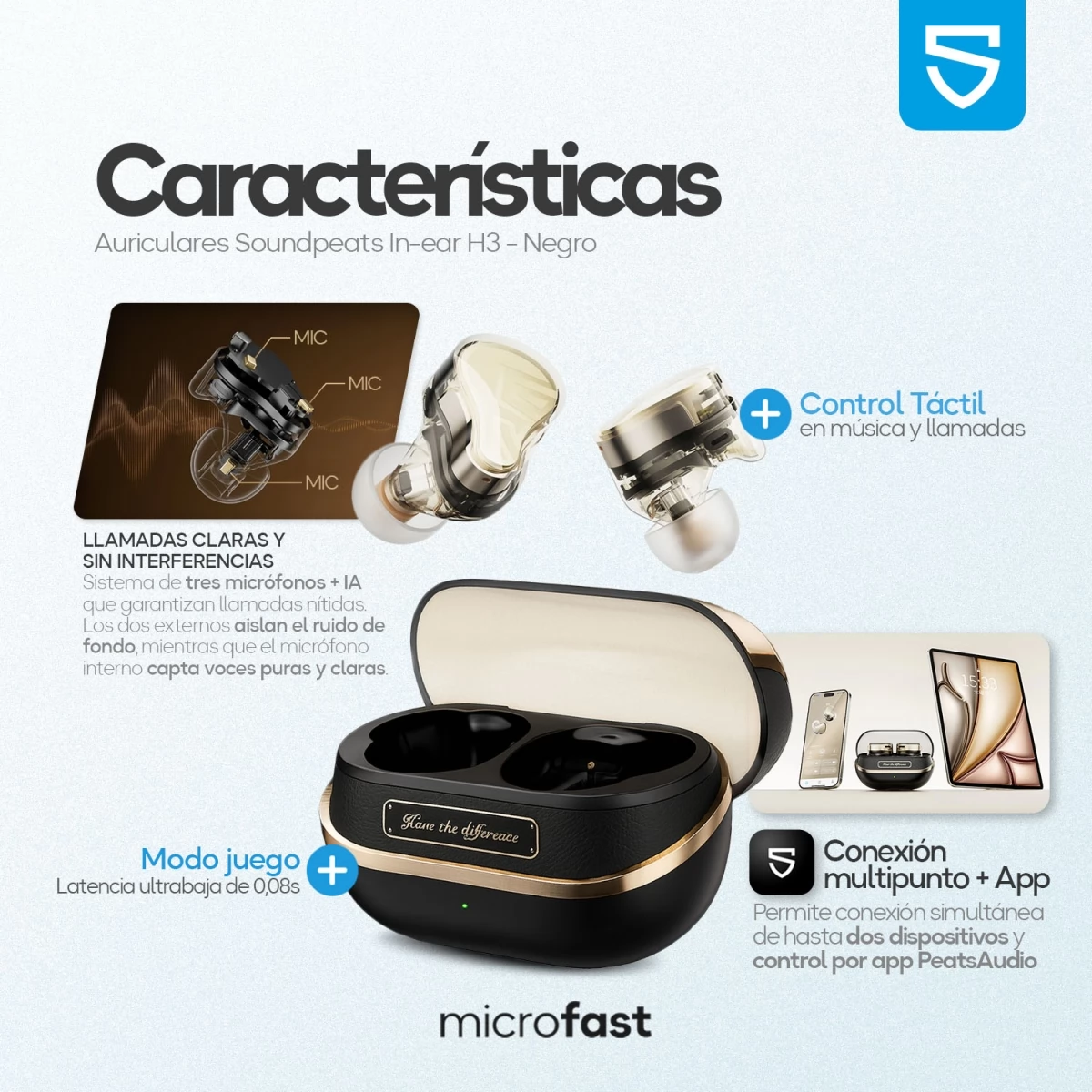 Los SoundPEATS H3 fueron diseñados para quienes buscan sonido de alta fidelidad y comodidad en un solo dispositivo. Incorporan cancelación activa de ruido híbrida (ANC) capaz de reducir hasta 45 dB del entorno, permitiendo disfrutar música, películas o llamadas sin interrupciones. También cuentan con modo transparencia, que mantiene la percepción del ambiente cuando es necesario. Con drivers dinámicos de 12 mm, los H3 brindan un sonido potente y balanceado, con graves profundos y agudos claros, optimizados para una experiencia de escucha inmersiva. La conectividad Bluetooth 5.4 asegura emparejamiento rápido, transmisión estable y menor consumo energético. Su batería permite hasta 7 horas de reproducción en modo estándar y aproximadamente 37 horas con el estuche de carga. La carga rápida vía USB-C completa la batería en unas 2 horas. Los controles táctiles integrados permiten manejar música, volumen, llamadas y el asistente de voz directamente desde los auriculares. Ideal para - Amantes de la música que buscan audio Hi-Fi con graves potentes. - Viajeros y usuarios de transporte público que necesiten cancelación activa de ruido. - Profesionales en home office o videollamadas. - Usuarios que priorizan la autonomía prolongada y comodidad. Ficha técnica - Modelo: SoundPEATS H3 - Formato: Open-Ear - Drivers: 12 mm dinámicos - Cancelación activa de ruido (ANC): Híbrida, hasta 45 dB - Modos: ANC on, ANC off, Transparencia - Bluetooth: 5.4 - Perfiles compatibles: HFP, A2DP, AVRCP - Alcance inalámbrico: hasta 10 m - Autonomía: 37 horas - Tiempo de carga: 2 h aprox. - Puerto de carga: USB-C - Batería: 400 mAh (estuche) 35 mAh*2 (auriculares) - Controles: Táctiles multifunción - Compatibilidad: Android, iOS, Windows, macOS, Linux - Peso aproximado: 53 g Qué incluye - 1 par de auriculares SoundPEATS H3 - 1 cable de carga USB-C - 1 manual de usuario Garantía oficial de 12 meses