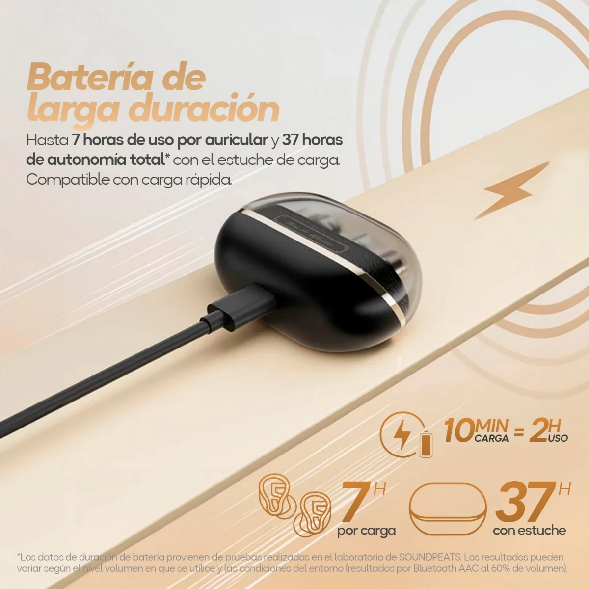 Los SoundPEATS H3 fueron diseñados para quienes buscan sonido de alta fidelidad y comodidad en un solo dispositivo. Incorporan cancelación activa de ruido híbrida (ANC) calidad premium capaz de reducir hasta 45 dB del entorno, permitiendo disfrutar música, películas o llamadas sin interrupciones. Ofrece 4 modos elegibles desde la app: -Adaptivo (transparente) que mantiene la percepción del ambiente cuando es necesario. -Ruido Ligero -Ruido Moderado -Ruido Intenso Con drivers dinámicos de 12 mm, los H3 brindan un sonido potente y balanceado, con graves profundos y agudos claros, optimizados para una experiencia de escucha inmersiva. La conectividad Bluetooth 5.4 asegura emparejamiento rápido, transmisión estable y menor consumo energético. Su batería permite hasta 7 horas de reproducción en modo estándar y aproximadamente 37 horas con el estuche de carga. La carga rápida vía USB-C completa la batería en unas 2 horas. Los controles táctiles integrados permiten manejar música, volumen, llamadas y el asistente de voz directamente desde los auriculares. La aplicación Peats Audio de SoundPEATS ofrece una interfaz intuitiva que te permite gestionar tus auriculares Bluetooth con facilidad: emparejarlos rápidamente, ecualizar el sonido a tu gusto, personalizar los gestos táctiles, controlar el volumen y las llamadas, ajustar los modos de cancelación de ruido, ver el nivel de batería en tiempo real de cada auricular y actualizar el firmware cuando haya nuevas funciones disponibles. La aplicación Peats Audio de SoundPEATS ofrece una interfaz intuitiva que te permite gestionar tus auriculares Bluetooth con total facilidad: emparejarlos rápidamente, ecualizar el sonido a tu gusto, personalizar los gestos táctiles, controlar volumen y llamadas, ajustar los distintos modos de cancelación de ruido y visualizar el nivel de batería en tiempo real de cada auricular y del estuche.Además, incorpora la Función Encontrar, que te permite localizar tus auriculares mediante alertas de sonido o consultar su última ubicación registrada, brindando mayor tranquilidad en el uso diario. Ideal para - Amantes de la música que buscan audio Hi-Fi con graves potentes. - Viajeros y usuarios de transporte público que necesiten cancelación activa de ruido. - Profesionales en home office o videollamadas. - Usuarios que priorizan la autonomía prolongada y comodidad. Ficha técnica - Modelo: SoundPEATS H3 - Formato: Open-Ear - Drivers: 12 mm dinámicos - Cancelación activa de ruido (ANC): Híbrida, hasta 45 dB - Modos: ANC on, ANC off, Transparencia - Bluetooth: 5.4 - Perfiles compatibles: HFP, A2DP, AVRCP - Alcance inalámbrico: hasta 10 m - Autonomía: 37 horas - Tiempo de carga: 2 h aprox. - Puerto de carga: USB-C - Batería: 400 mAh (estuche) 35 mAh*2 (auriculares) - Controles: Táctiles multifunción - Compatibilidad: Android, iOS, Windows, macOS, Linux - Peso aproximado: 53 g Qué incluye - 1 par de auriculares SoundPEATS H3 - 1 cable de carga USB-C - 1 manual de usuario