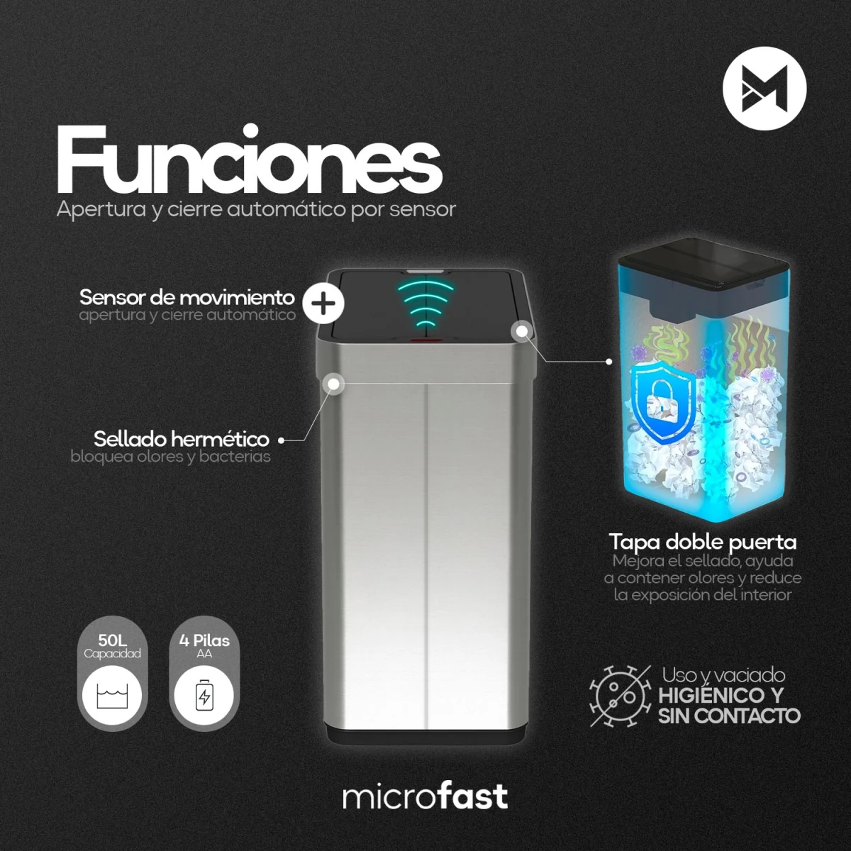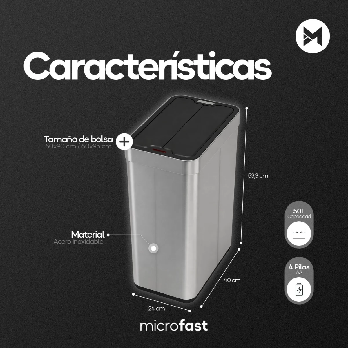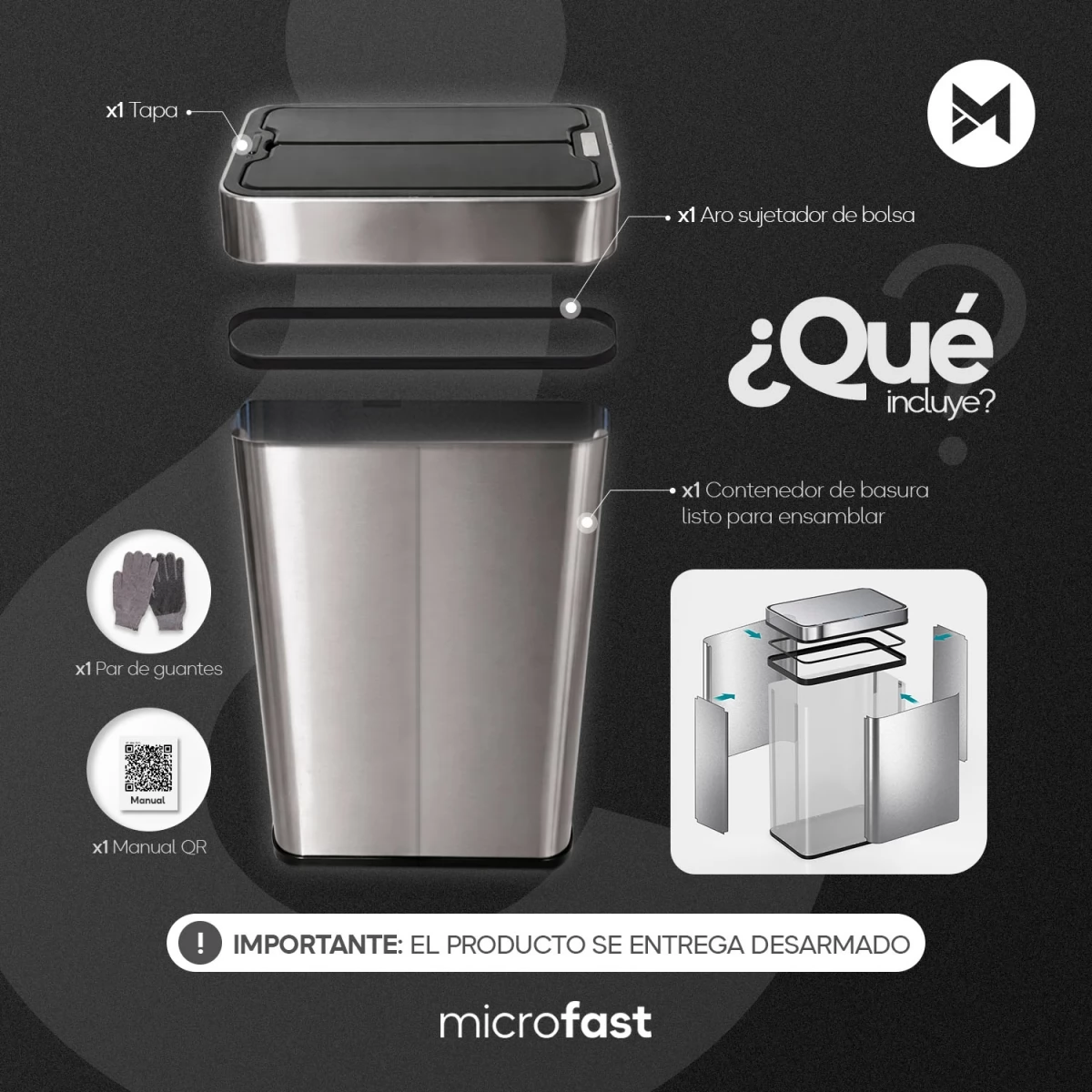 IMPORTANTE! El cesto viene desarmado. Contamos con videos tutoriales. Diseñado para el uso diario Fabricado con cuerpo de acero inoxidable y componentes plásticos de alta resistencia, este cesto está pensado para un uso cotidiano confiable. Su sistema electrónico funciona con 4 pilas AA (no incluidas) y ofrece un rendimiento estable para el manejo diario de residuos, manteniendo un funcionamiento simple y eficiente Manos libres Olvidate de tocar la tapa. El sensor infrarrojo detecta el movimiento de la mano u objetos, activando la apertura automática. Luego de unos segundos sin detección, el cesto se cierra de forma automática. La tapa incorpora un indicador lumínico que muestra el estado del cesto (encendido y apagado) y señala el tiempo restante antes del cierre automático. Además, cuenta con botón táctil de apertura y cierre manual, ideal para mantener la tapa abierta cuando lo necesites. Apertura de doble puerta La tapa cuenta con un sistema de doble puerta abatible, que se abre desde el centro hacia ambos lados. Este diseño mejora el sellado, ayuda a contener olores y reduce la exposición del interior, aportando mayor higiene y una apariencia más prolija en cada uso. Armado e instalación El cesto se entrega desarmado para facilitar su transporte. El armado es simple y rápido: 1-Colocá la base sobre una superficie firme. 2-Encastrá los paneles laterales y frontales siguiendo el orden indicado en el manual. 3-Ajustá las piezas mediante los encastres incluidos, sin necesidad de herramientas especiales. 4-Colocá la tapa superior con el sistema de apertura automática. 5-Abrí el compartimento de baterías, insertá las 4 pilas AA respetando la polaridad y encendé el equipo Se recomienda leer atentamente el manual antes del primer uso para asegurar un correcto funcionamiento y prolongar la vida útil del producto. Diseño moderno y funcional Su diseño limpio y contemporáneo en color plateado permite integrarlo fácilmente en distintos ambientes. Más que un cesto de basura, es una solución funcional que aporta practicidad a cocinas, oficinas o espacios interiores. Ficha Técnica -Modelo: MF-813-50PL -Capacidad: 50 litros -Material del cuerpo: Acero inoxidable + PP -Color: Plateado -Dimensiones: 53,5cm x 24cm x 40cm -Dimensiones con tapa abierta: 64x,5cm x 24cm x 40cm -Dimensiones del cesto desarmados: 53,5 x 18,5 x 33 cm -Compatibilidad de bolsa: 60×90 o 60×95 cm -Ubicación recomendada: Interior -Tipo de apertura: Automática por sensor + botón táctil manual -Sujetador de bolsa: Sí -Alimentación: 4 pilas AA (no incluidas) -Indicador luminoso: Sí -Formato: Cesto ensamblable -Distancia de detección del sensor: 15 cm -Tiempo de cierre automático: 5 segundos -Duración estimada de pilas: Aproximadamente 3 meses (uso promedio de 20 aperturas diarias) Contenido de la caja x1 Tapa con sistema de apertura automática y botón táctil x1 Aro sujetador de bolsa x1 Base x4 Varillas deslizantes x1 Parte superior x4 Paneles x2 Guantes x4 Bases y gomas antideslizantes x4 Clip x3 Clip superior Manual de usuario ATENCIÓN Sugerimos no descartar ningún componente del empaquetado. En caso de devoluciones, será requisito enviarlo completo para poder realizar la reposición correctamente.